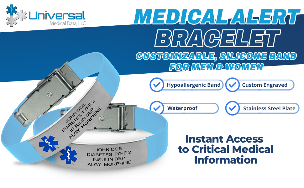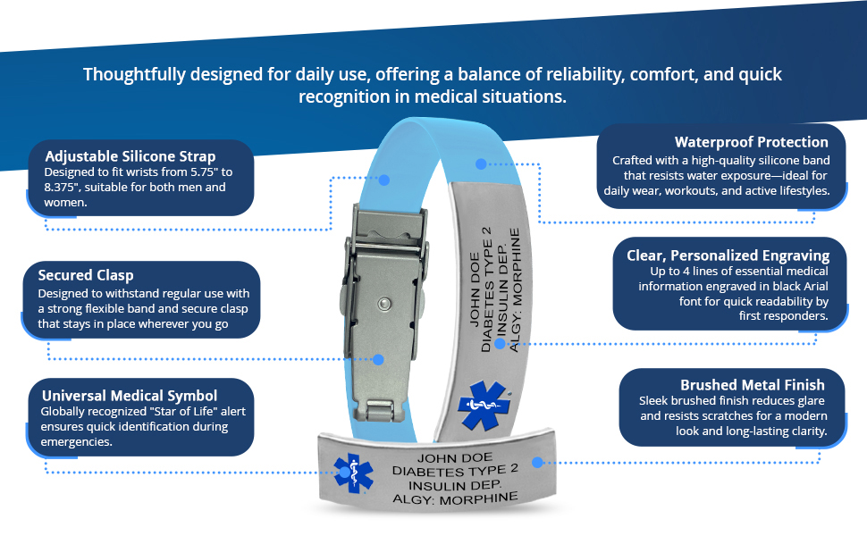- Quick-Recognize Medical Alert Symbol: Featuring a distinct blue epoxy Medical ID symbol, this bracelet is easily recognized by medical personnel, ensuring that your medical alert is immediately visible. The engraved symbol helps professionals identify your needs quickly, providing faster, more accurate care.