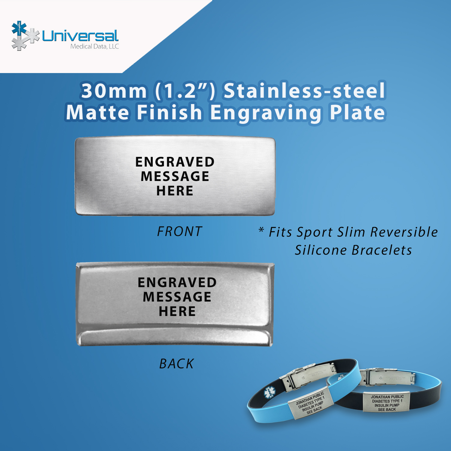The 30mm (1.2”) Stainless Steel Matte Finish Engraving Plate is a compact, durable medical ID solution designed specifically for Sport Slim Reversible Silicone Medical Alert Bracelets. Precision laser engraving ensures clear, long-lasting readability of critical medical information on both the front and back.