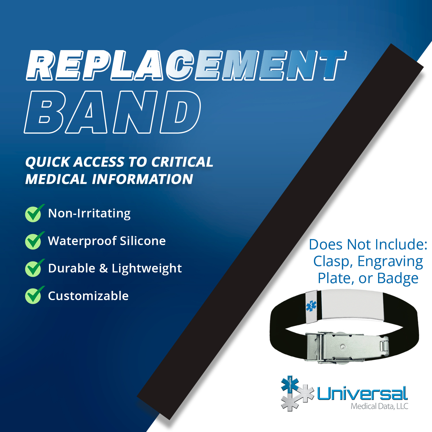 Silicone replacement band for the Ultra Slim medical alert bracelet. This item is the band only and does not include the engraving plate.